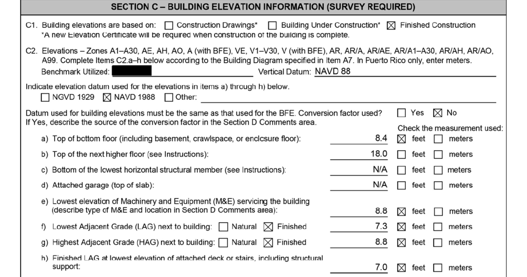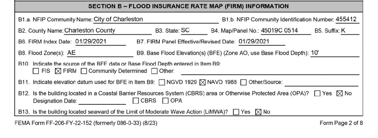 Section B of the form below shows that this property is in an AE flood zone, elevation 10 (see B8 and B9 on the form). This means that the base flood elevation (BFE) is 10 feet above mean sea level (MSL). The required freeboard for the existing building is 1 foot. The DFE (design flood elevation = BFE + 1ft freeboard) for this property is 11 feet.